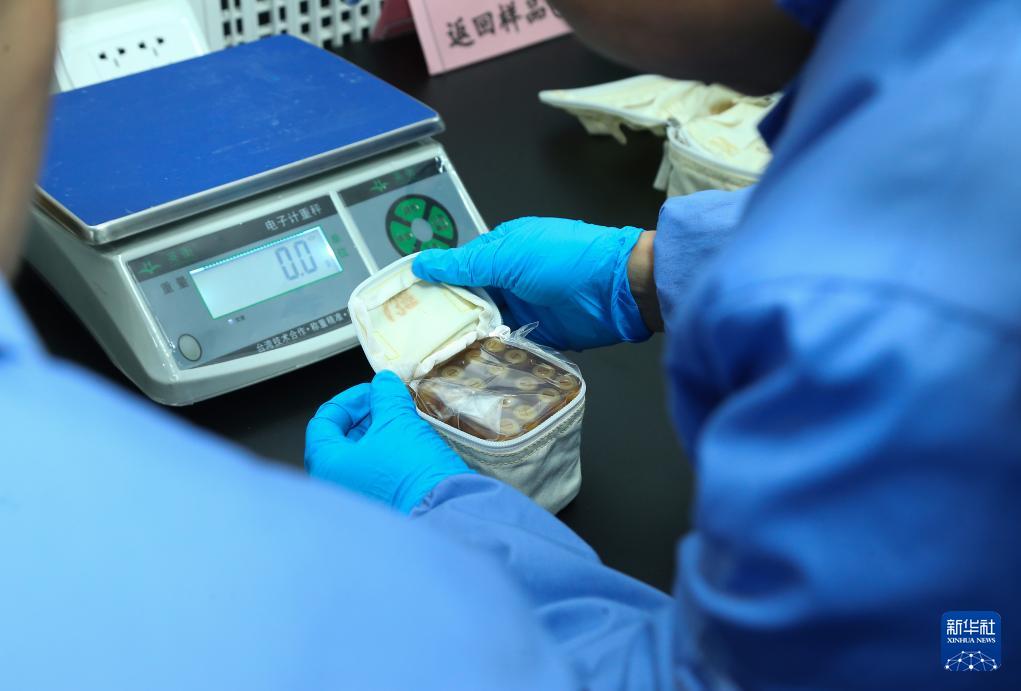 11月4日,在位于北京的中國(guó)科學(xué)院空間應(yīng)用工程與技術(shù)中心,工作人員檢查返回實(shí)驗(yàn)樣品的狀態(tài)。