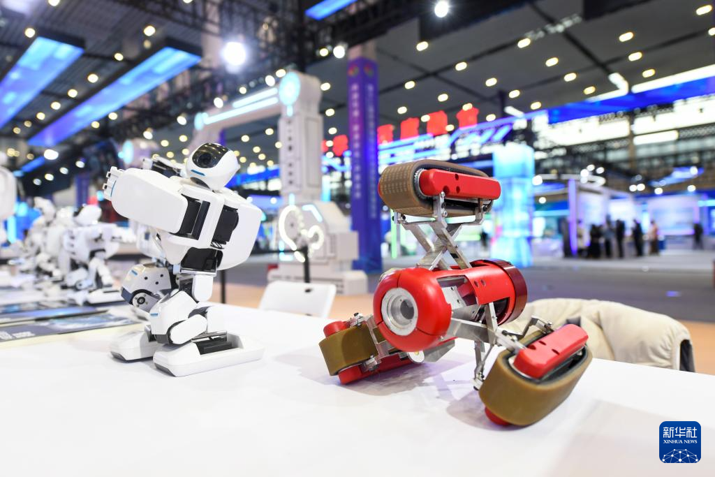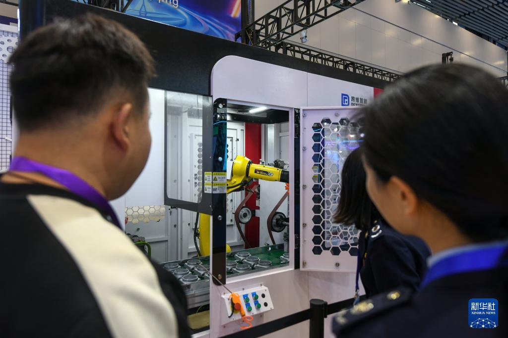 11月6日,在第十二屆中國(綿陽)科技城國際科技博覽會(huì)現(xiàn)場,參會(huì)者觀看運(yùn)行中的工業(yè)機(jī)器人。