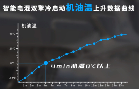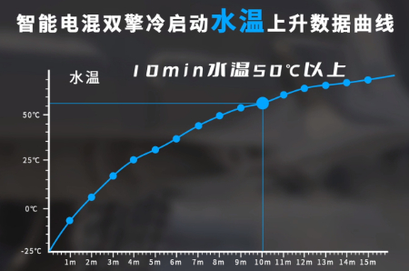 低溫冷啟動依靠發(fā)動機性能,需要在合適的溫度、潤滑條件下才可以啟動成功,并實現(xiàn)經濟的性能表現(xiàn),兩輛車在極寒環(huán)境里,發(fā)動機怠速工作,油溫升到0攝氏度以上,僅需約4min,以較快的速度進入了高效潤滑區(qū)間,使車輛啟動瞬間響應,同時也為實現(xiàn)低溫低能耗打下了技術基礎。 怠速不到10分鐘,水溫即可升到接近50℃,在當地這種極寒環(huán)境下,相較常規(guī)燃油車暖車10min-15min的暖車時間表現(xiàn),可以說表現(xiàn)良好。