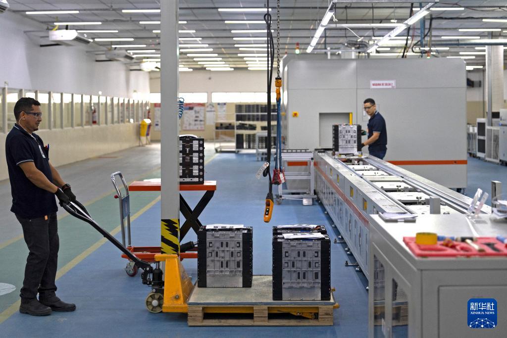 3月12日,工作人員在位于巴西亞馬孫州馬瑙斯的比亞迪電池工廠對(duì)電池組進(jìn)行測(cè)試。