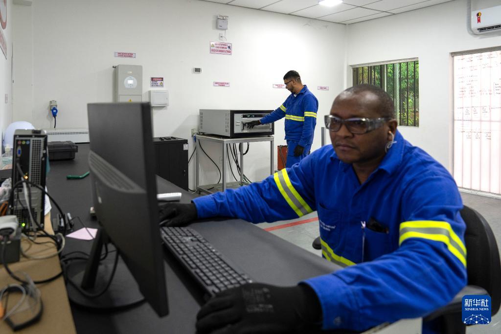 3月12日,工作人員在位于巴西亞馬孫州馬瑙斯的比亞迪電池工廠使用儀器測(cè)試電池容量。