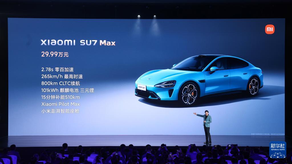 3月28日,小米集團(tuán)創(chuàng)始人、董事長(zhǎng)兼CEO雷軍在發(fā)布會(huì)上介紹小米SU7汽車。