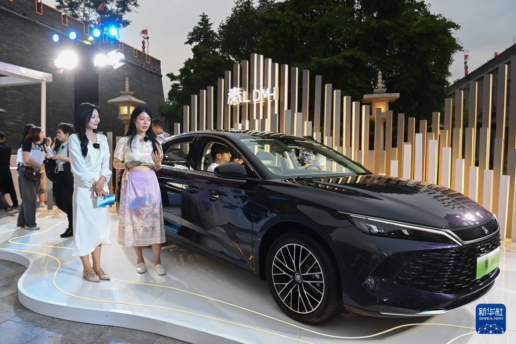 5月28日,參觀者在西安城墻永寧門了解比亞迪秦L DM-i新車型。