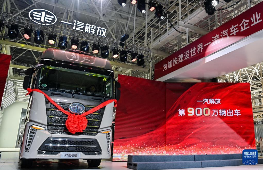 當(dāng)日,一輛解放J7創(chuàng)領(lǐng)版高端重卡在吉林省長春市緩緩駛下生產(chǎn)線。這標(biāo)志著我國自主研發(fā)的第900萬輛解放牌卡車正式出車,同時也標(biāo)志著“新中國汽車工業(yè)的搖籃”中國一汽總產(chǎn)量達(dá)到6000萬輛。