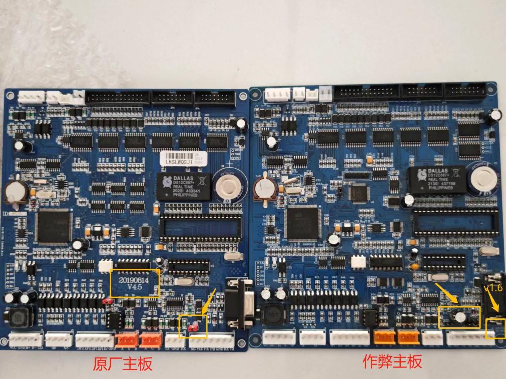 加油機原廠計控主板和非原廠主板對比圖。(重慶市市場監(jiān)管綜合行政執(zhí)法總隊供圖)