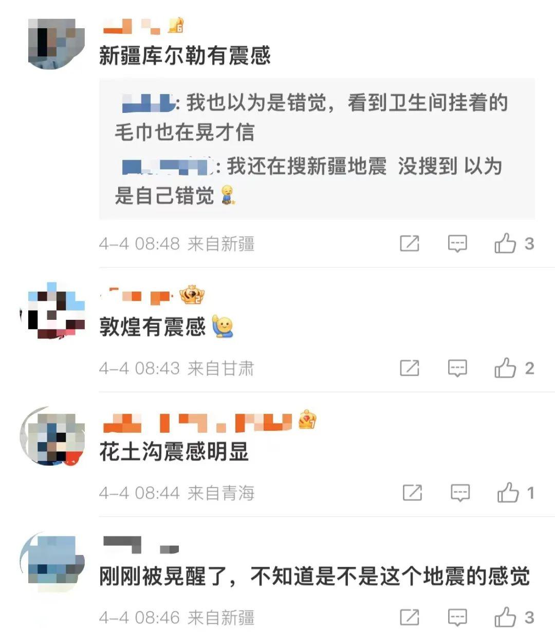 新疆烏魯木齊、庫爾勒,甘肅敦煌等地網(wǎng)友表示有震感。