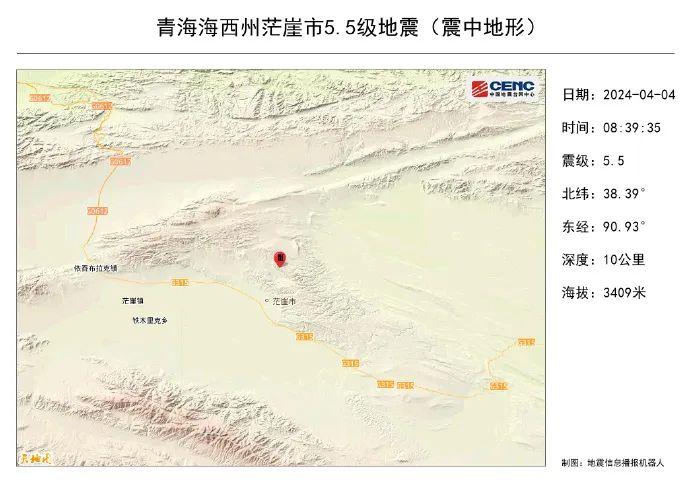 中國(guó)地震臺(tái)網(wǎng)正式測(cè)定:4月4日8時(shí)39分在青海海西州茫崖市(北緯38.39度,東經(jīng)90.93度)發(fā)生5.5級(jí)地震,震源深度10千米。