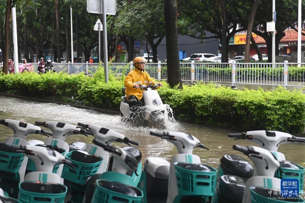 5月19日,人們騎車從南寧東葛路積水處通過(guò)。