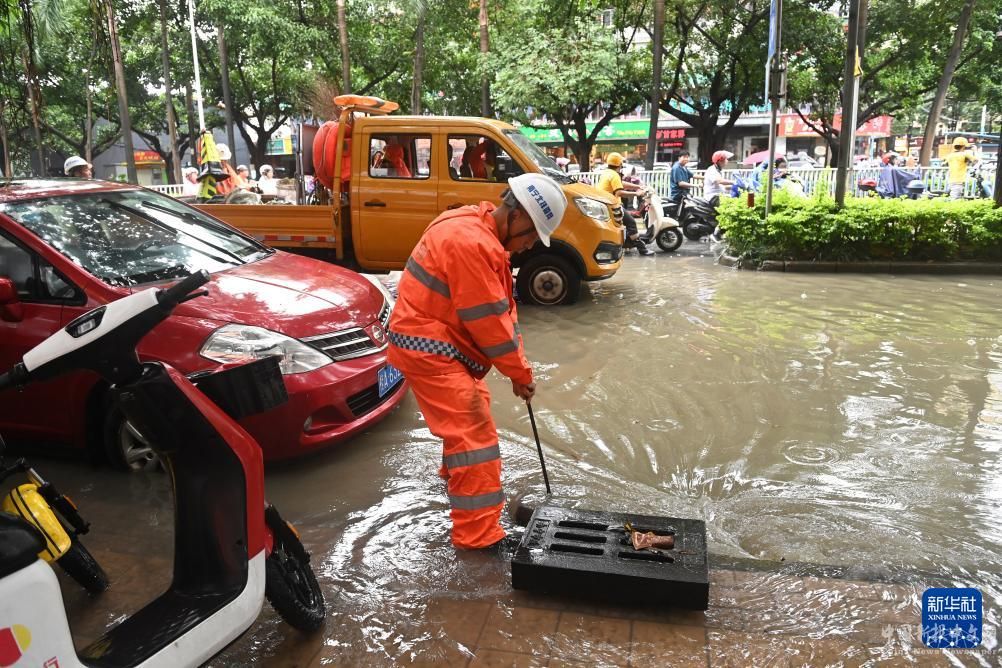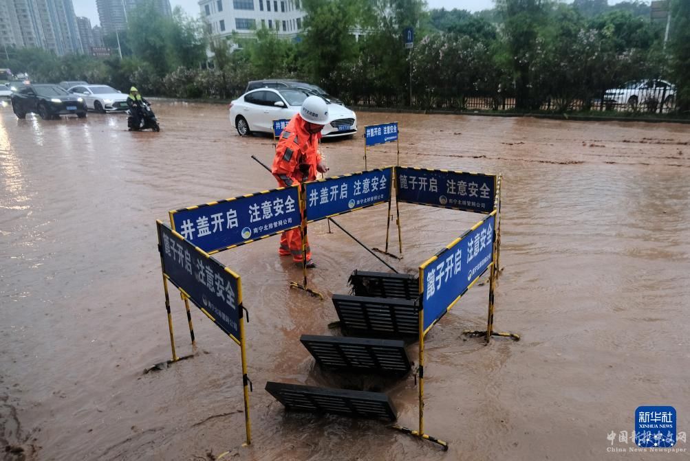 5月19日,在南寧青環(huán)路上,工作人員將下水道篦子打開(kāi)加快積水下泄速度。