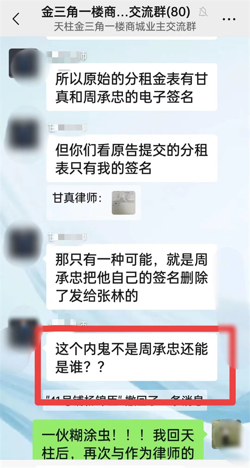 被告甘真在法庭及微信群里的誣陷言詞引起了被告李文芳(微信名:昆明)等部分業(yè)主對周承忠強(qiáng)烈不滿。他們直接罵周承忠是“內(nèi)鬼”、“內(nèi)奸”,還說:“吃別人的血汗錢,要斷子絕孫”、“內(nèi)鬼的那個(gè)不得好死”……不明真相的業(yè)主還紛紛表示:“支持甘真律師,相信法律是公正的”。