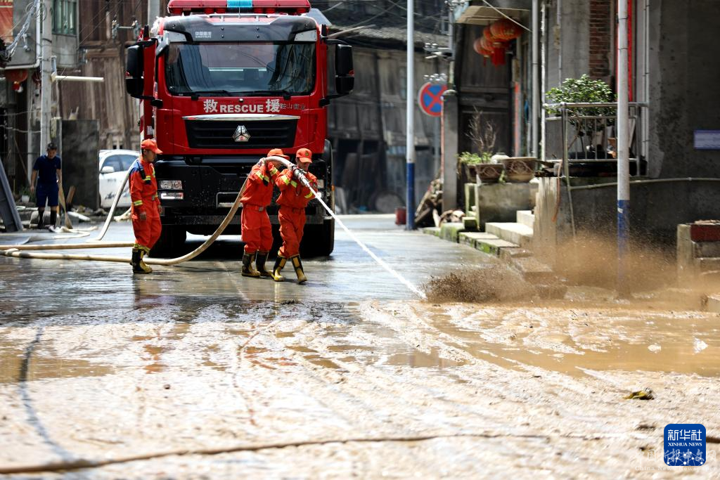6月17日,在福建省龍巖市武平縣中堡鎮(zhèn),消防人員幫助群眾清理淤泥。