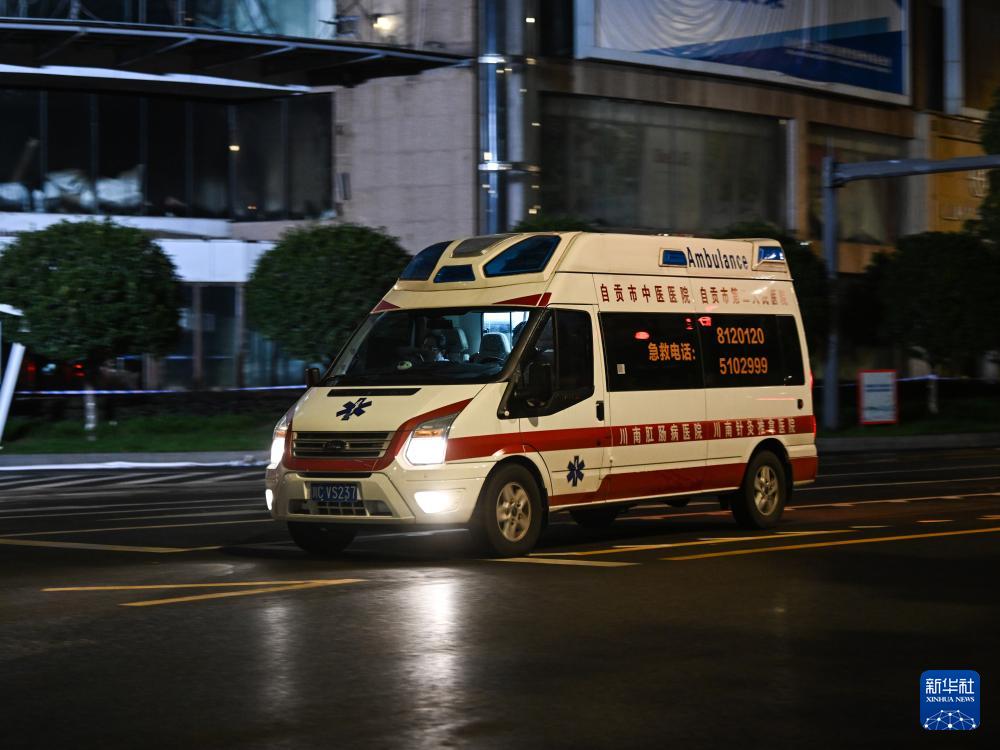 7月18日凌晨,救護車行駛在四川省自貢市高新區(qū)發(fā)生火災的大樓附近。新華社記者 王曦 攝