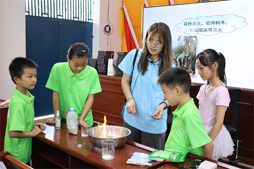 在化學(xué)實(shí)驗(yàn)展演中,志愿者通過洗潔精、雙氧水、碘化鉀的化學(xué)反應(yīng)制造泡沫,用燃燒鐵粉制造絢麗的煙花,將化學(xué)實(shí)驗(yàn)現(xiàn)象融入小學(xué)生喜聞樂見的哆啦A夢故事里,還通過分步驟講解凈水原理開展水教育,提升科普學(xué)習(xí)體驗(yàn)。在生物課堂上,志愿者通過蝴蝶和蛾子的觸角形狀、停歇狀態(tài)、活動時(shí)間及外形特征講解兩者區(qū)別,結(jié)合趣味游戲和標(biāo)本制作,助孩子們探索昆蟲奧秘。“熊出沒森林表演大會之猜猜我是誰”課堂以現(xiàn)場劇目表演進(jìn)行引入,向孩子們科普哺乳動物的知識,講解森林防火原理,呼吁孩子們樹牢安全意識,保護(hù)自然環(huán)境。“我長大后要做森林消防員,保護(hù)我們的大森林!”孩子們在課后的感悟展現(xiàn)了對自然的敬畏與青少年的責(zé)任擔(dān)當(dāng)。