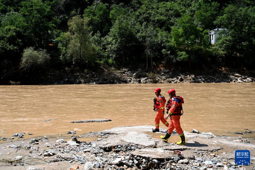 7月21日,救援人員在陜西柞水高速公路橋梁垮塌下游河道進(jìn)行搜救。