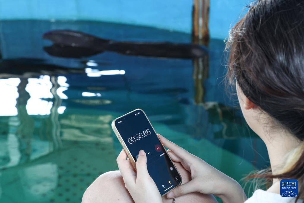 8月2日,在海南三亞海昌生物保育中心,志愿者在救助池邊記錄短肢領(lǐng)航鯨“海莉”的呼吸頻率。新華社記者 張麗蕓 攝