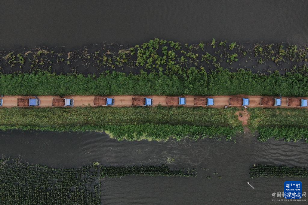 8月7日,搶險人員運送物料加固河堤(無人機照片)。