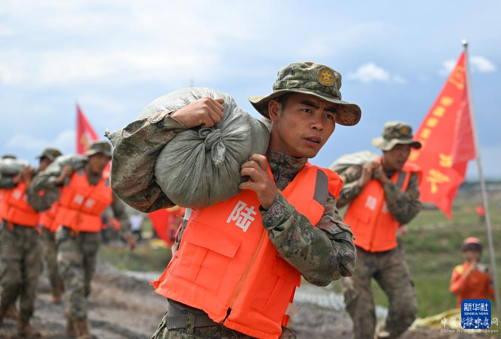 8月14日,搶險人員在內(nèi)蒙古赤峰市老哈河堤防潰口現(xiàn)場搬運沙袋。