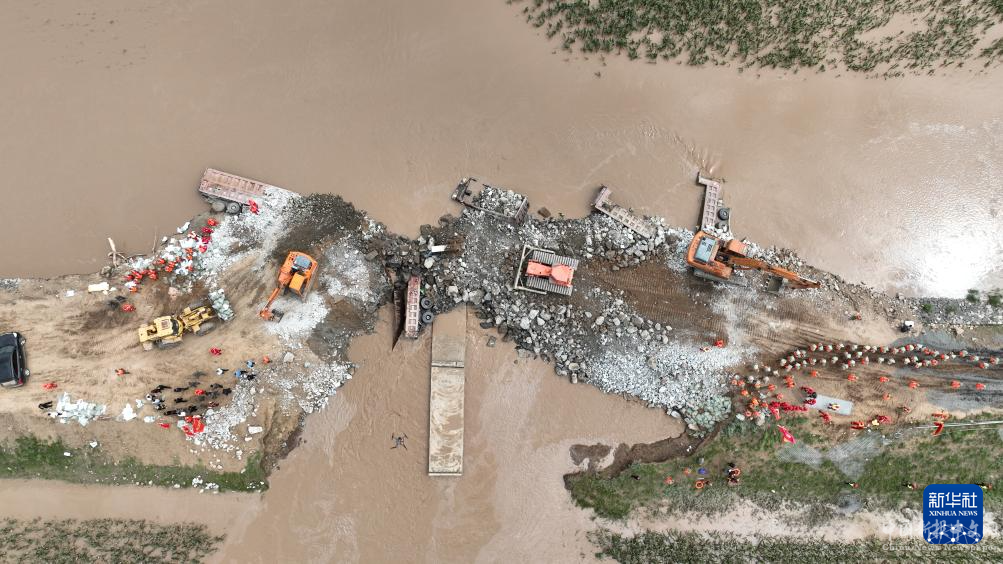 8月14日,內(nèi)蒙古赤峰市老哈河堤防潰口合龍(無人機(jī)照片)。