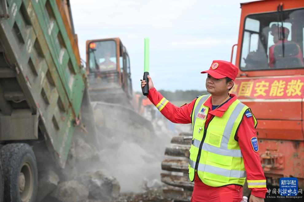 8月14日,搶險人員在內(nèi)蒙古赤峰市老哈河堤防潰口搶險現(xiàn)場指揮大型機(jī)械。