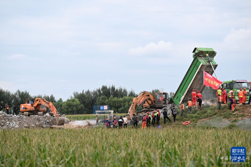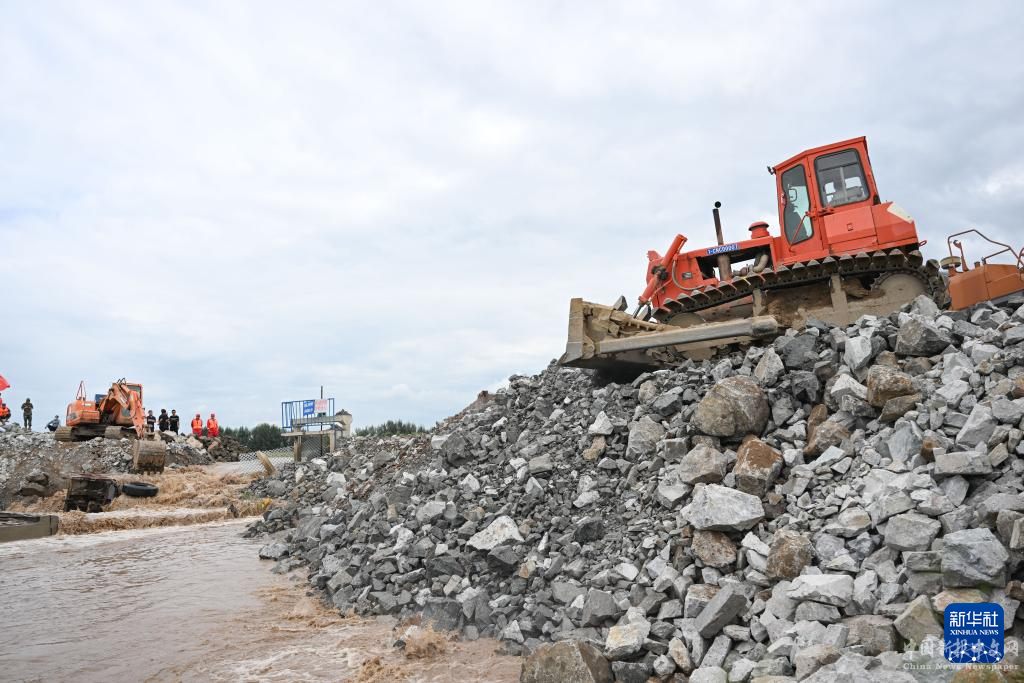 8月14日,大型機(jī)械在內(nèi)蒙古赤峰市老哈河堤防潰口搶險現(xiàn)場作業(yè)。