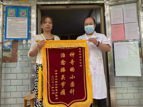 來自湘潭的胡女士,因家人在汝城做生意而居住在此。2021 年 7 月,胡女士膝關(guān)節(jié)疼痛伴活動受限,下蹲困難。在他人的推薦下,胡女士慕名找到廖岸峰醫(yī)生。廖醫(yī)生耐心地與胡女士溝通病情,詳細地告知治療方案,胡女士欣然接受。經(jīng)過廖醫(yī)生的精心治療,運用小圓針配合多種針法和康復(fù)理療,胡女士的膝關(guān)節(jié)很快恢復(fù)了正常,疼痛消失,活動自如。當(dāng)年9 月,胡女士特意送來錦旗,表達對廖醫(yī)生的深深感謝。