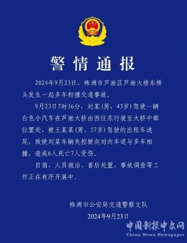湖南省株洲市公安局交通警察支隊(duì)發(fā)布警情通報(bào),2024年9月23日,株洲市蘆淞區(qū)蘆淞大橋東橋頭發(fā)生一起多車相撞交通事故。