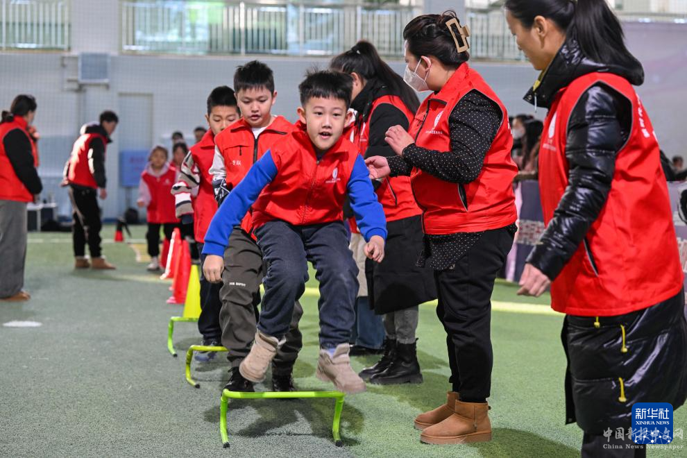 1月18日,兒童在呼倫貝爾學(xué)院體育館參加趣味體能比賽。