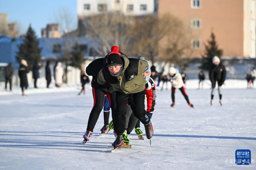 1月18日,呼倫貝爾市海拉爾區(qū)第七中學(xué)的學(xué)生們在校園里滑冰。