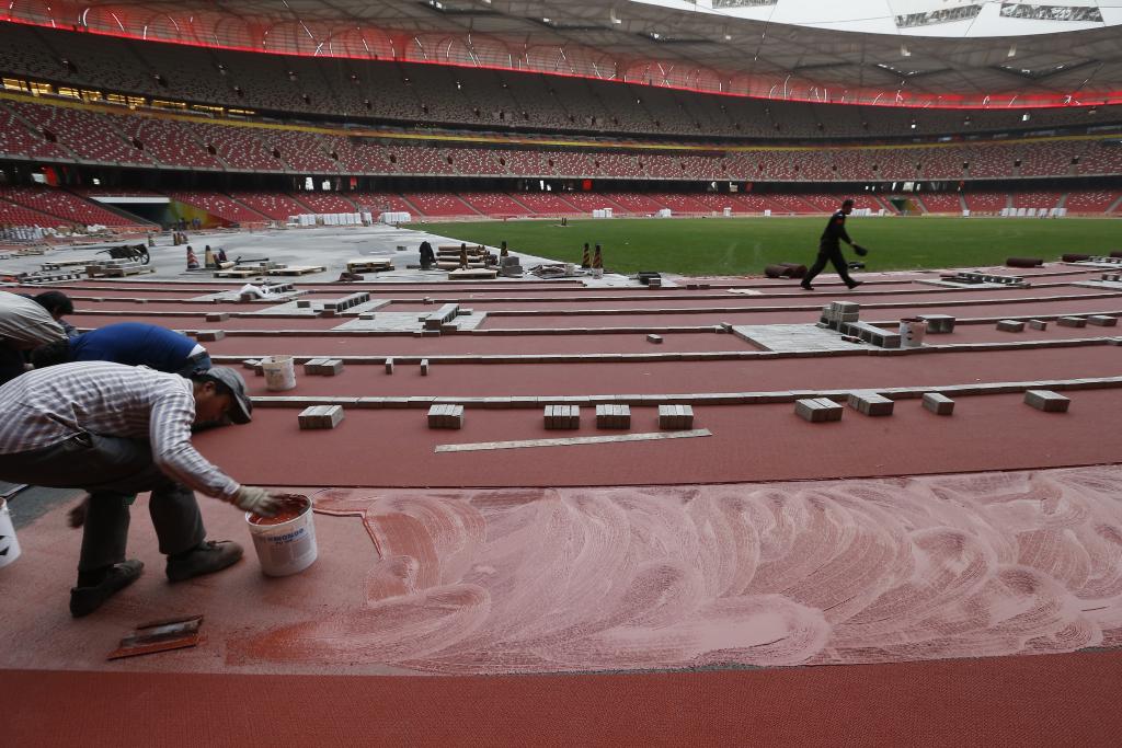 資料圖:2015年3月29日,工作人員在“鳥巢”鋪設(shè)專業(yè)預(yù)制塑膠跑道,為當(dāng)年在北京舉行的田徑世錦賽做準(zhǔn)備。新華社發(fā)