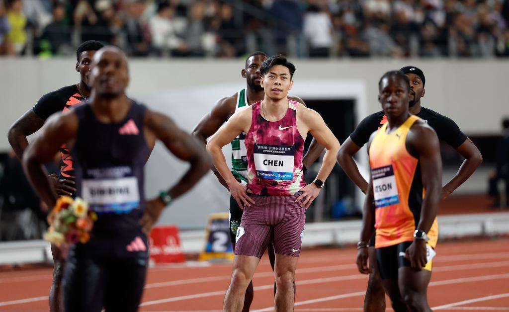 4月27日,中國選手陳冠鋒(中)在男子100米比賽后,他位列第九。新華社記者 王麗莉 攝