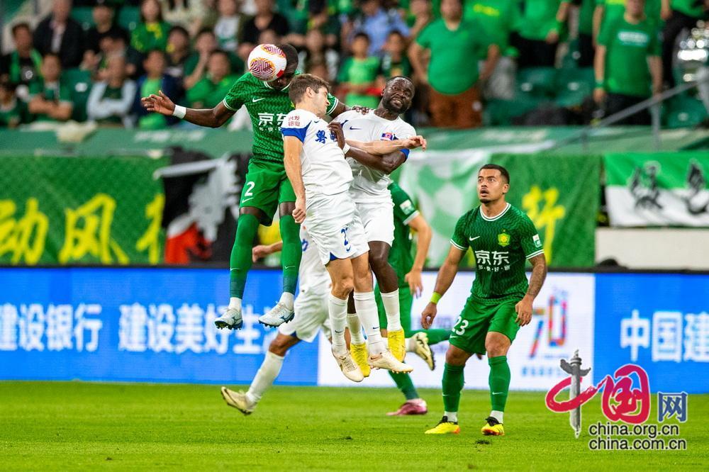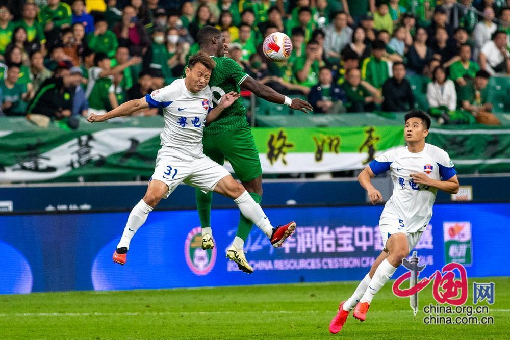 5月11日,2024賽季中超聯(lián)賽進行第11輪,北京國安隊在主場以3比2逆轉(zhuǎn)梅州客家隊,豪取五連勝。圖為北京國安隊外援爭頂頭球。中國網(wǎng)記者 鄭亮 攝影