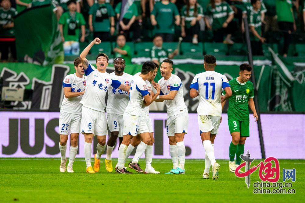 5月11日,2024賽季中超聯(lián)賽進行第11輪,北京國安隊在主場以3比2逆轉(zhuǎn)梅州客家隊,豪取五連勝。圖為客隊隊員慶祝進球。中國網(wǎng)記者 鄭亮攝