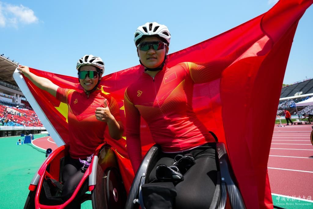 5月21日,中國選手田雅娟(右)和隊友周召倩在女子1500米T54級別決賽后合影。新華社記者 張笑宇 攝