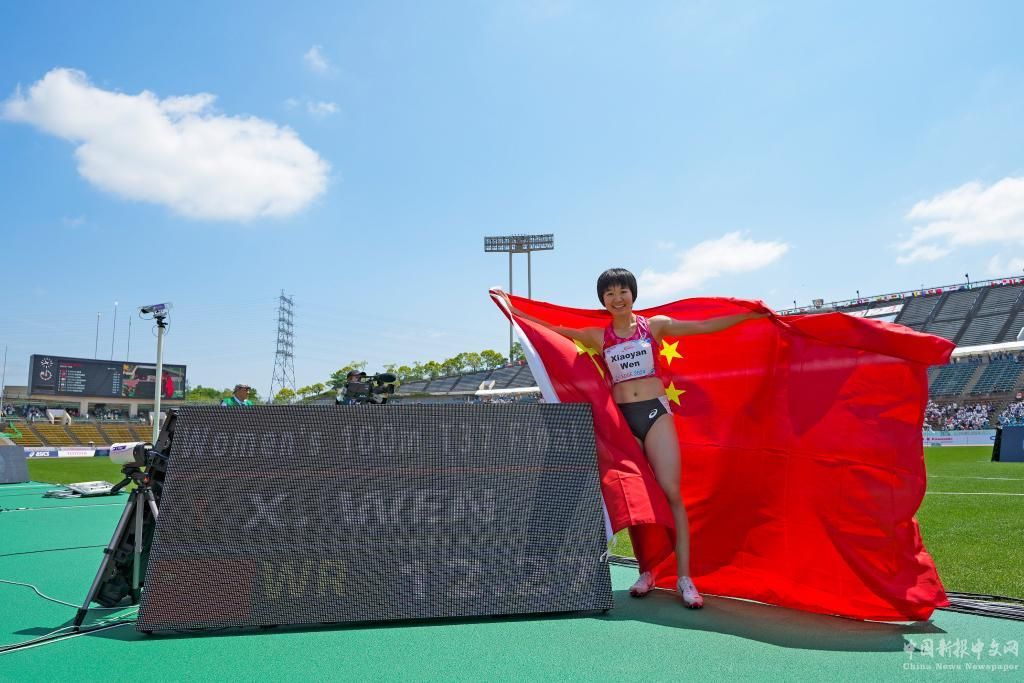 5月21日,中國選手文曉燕在女子100米T37級別決賽后慶祝。新華社記者 張笑宇 攝
