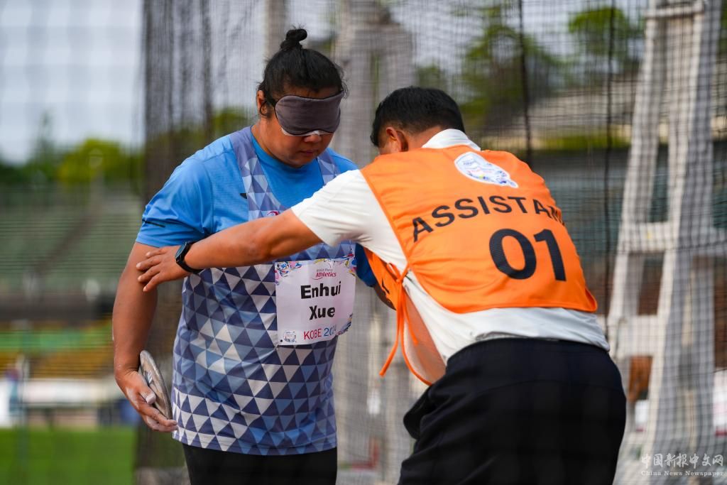 5月24日,教練李秀清(右)在女子鐵餅F11級別決賽中幫助中國選手薛恩慧定位投擲點。新華社記者 張笑宇 攝