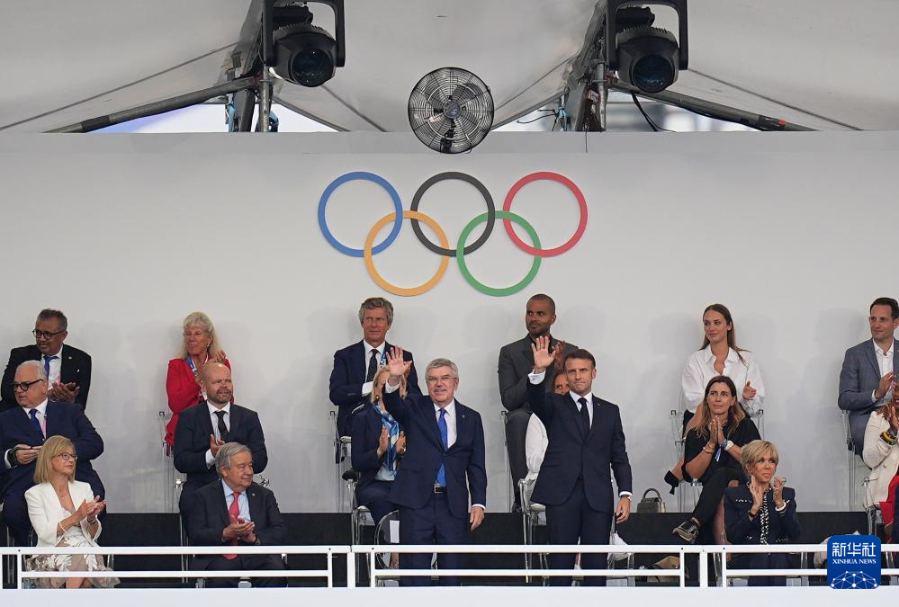 7月26日,國際奧委會主席巴赫(上左)和法國總統馬克龍出席開幕式。新華社記者 高靜 攝