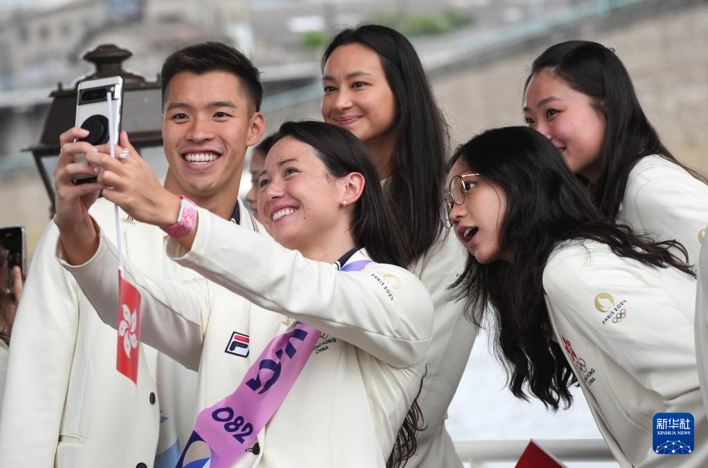 7月26日,中國香港體育代表團成員在開幕式上自拍。新華社記者 呂小煒 攝