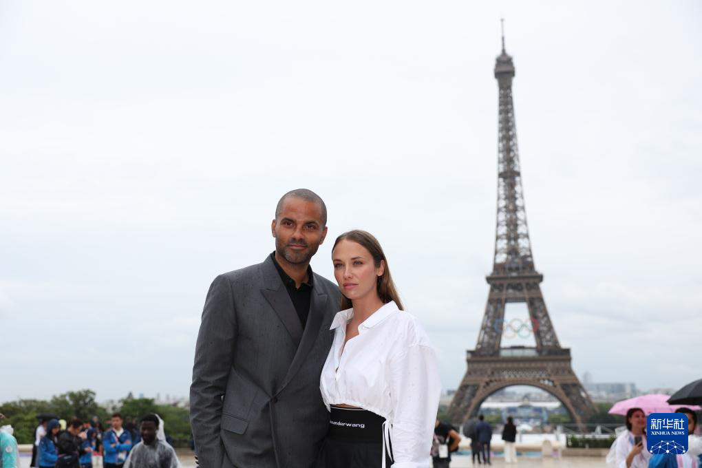 7月26日,法國籃球名宿托尼·帕克(左)在開幕式開始前合影。新華社記者 李穎 攝