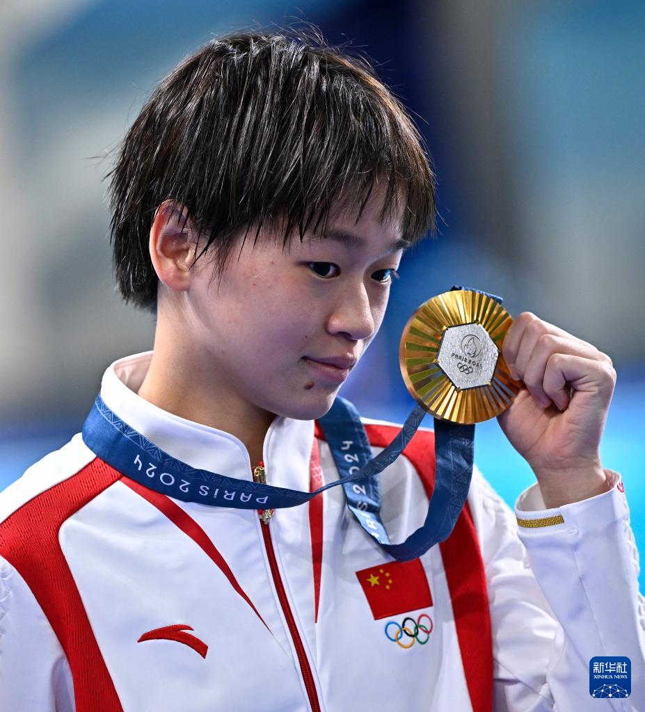 8月6日,全紅嬋展示金牌。新華社記者 王鵬 攝