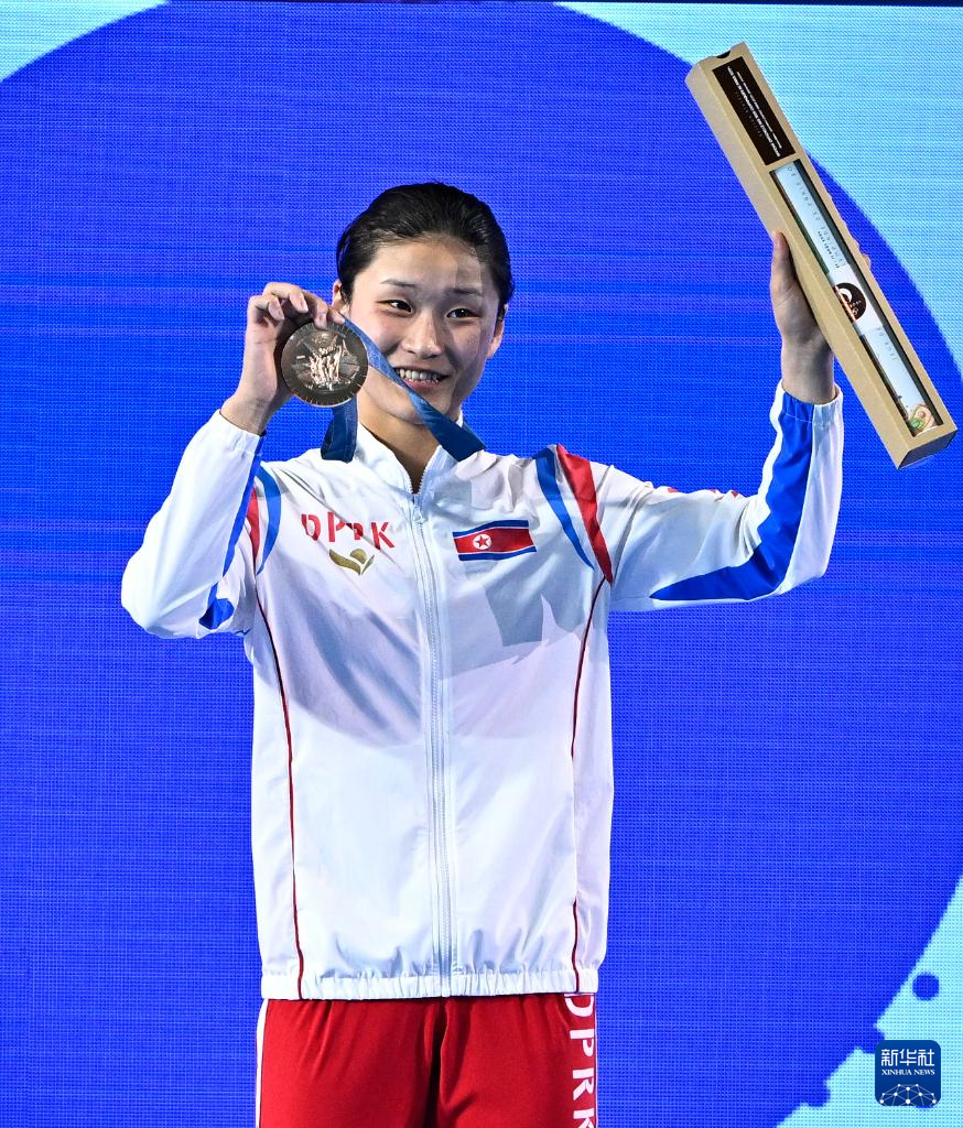 8月6日,冠軍中國選手全紅嬋(前中)、亞軍中國選手陳芋汐(前左)、季軍朝鮮選手金姬燕(前右)在頒獎儀式上。新華社記者 張玉薇 攝