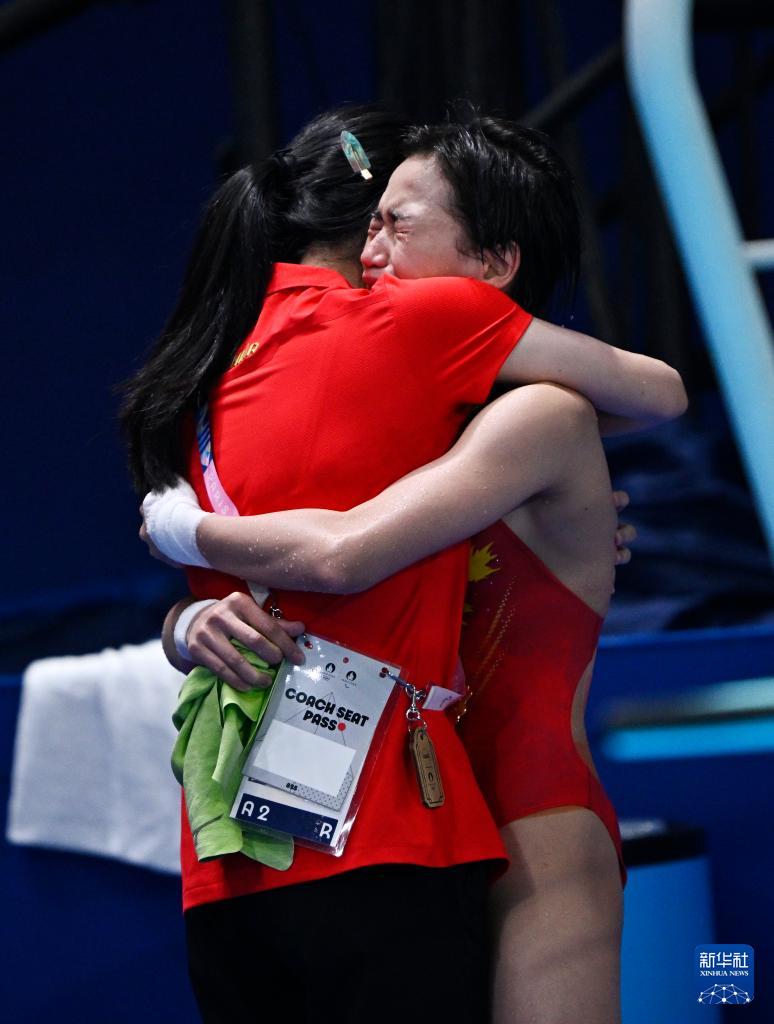 8月6日,中國選手全紅嬋(右)與教練陳若琳慶祝。新華社記者 張玉薇 攝