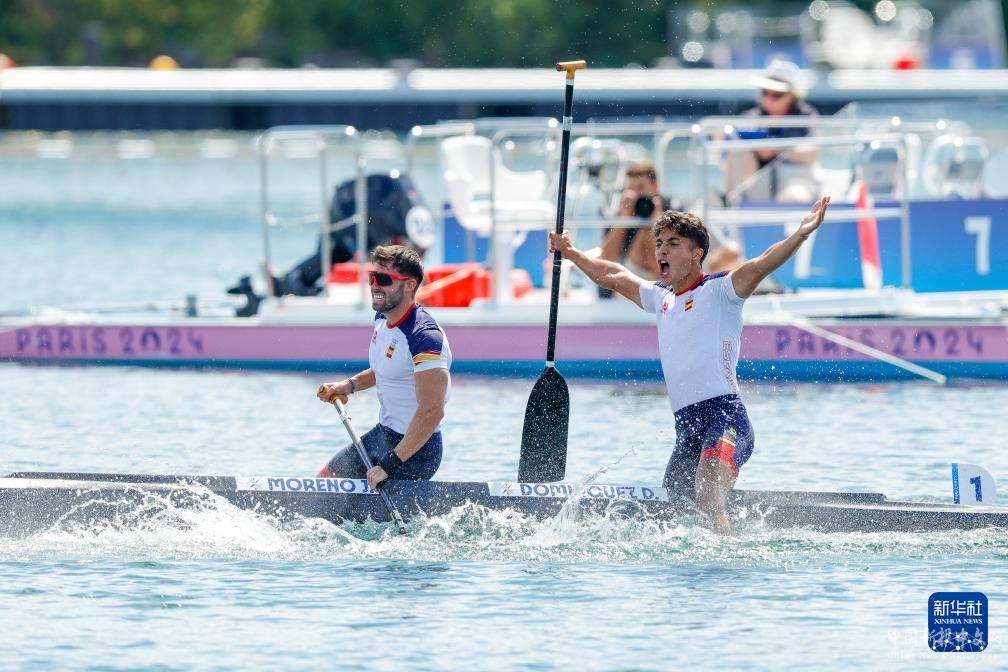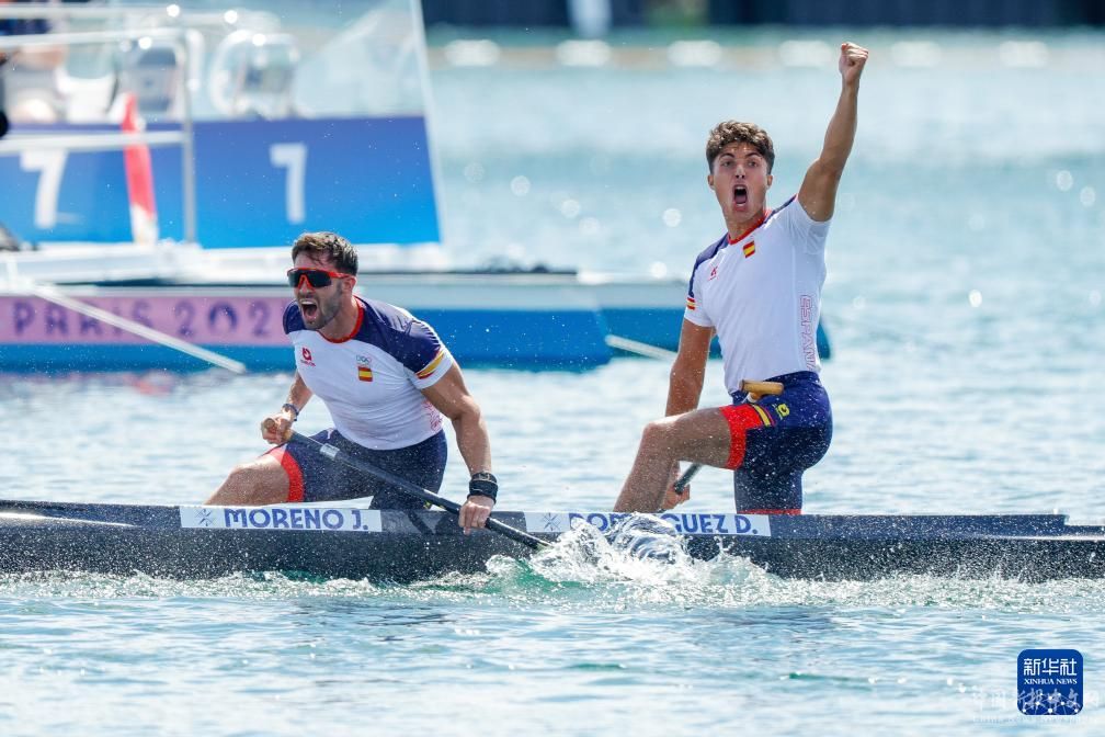 8月8日,西班牙選手莫雷諾(左)、多明格斯在比賽后慶祝。最終,他們獲得季軍。新華社記者 沈伯韓 攝