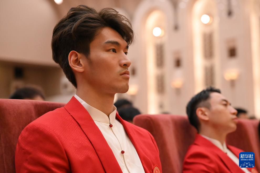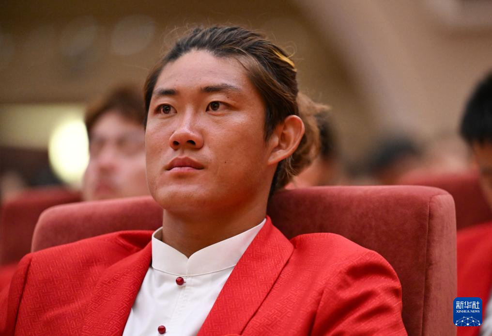 8月20日,射擊運動員盛李豪、游泳運動員潘展樂、乒乓球運動員馬龍、網(wǎng)球運動員鄭欽文(前排,從左至右)在總結大會上。