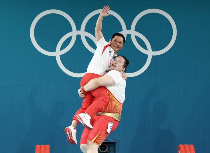 中國(guó)選手李雯雯(下)在巴黎奧運(yùn)會(huì)舉重女子81公斤以上級(jí)比賽后抱起教練吳美錦慶祝奪冠(2024年8月11日攝)。新華社記者 楊磊 攝