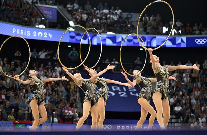 中國(guó)隊(duì)在巴黎奧運(yùn)會(huì)藝術(shù)體操集體全能決賽中(2024年8月10日攝)。新華社記者 程敏 攝