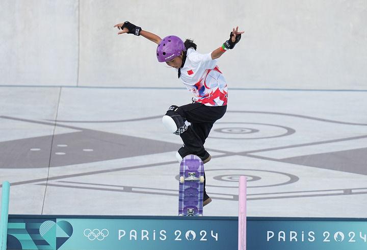 中國(guó)選手崔宸曦在巴黎奧運(yùn)會(huì)滑板女子街式?jīng)Q賽中(2024年7月28日攝)。新華社記者 孟永民 攝