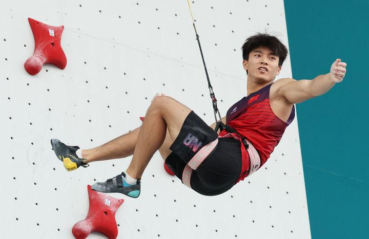 中國(guó)選手伍鵬在巴黎奧運(yùn)會(huì)攀巖男子速度賽半決賽后慶祝(2024年8月8日攝)。新華社記者 高靜 攝