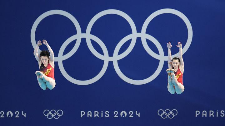 冠軍中國(guó)選手昌雅妮(右)/陳藝文在巴黎奧運(yùn)會(huì)跳水女子雙人3米板決賽中(2024年7月27日攝)。新華社記者 李明 攝