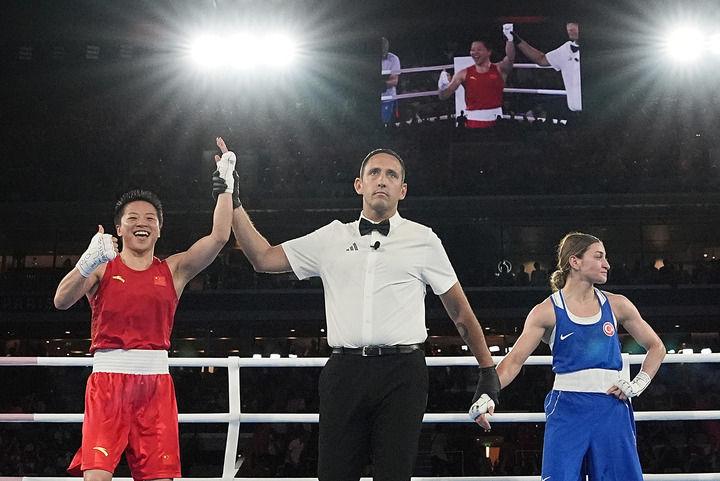 裁判在巴黎奧運(yùn)會(huì)拳擊女子50公斤級(jí)決賽中宣布中國(guó)選手吳愉(左)獲勝(2024年8月9日攝)。新華社記者 江文耀 攝