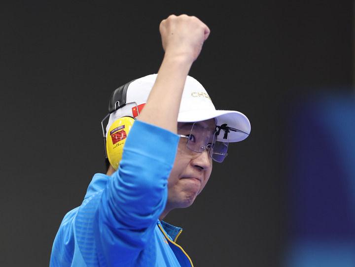 中國(guó)選手李越宏在巴黎奧運(yùn)會(huì)射擊男子25米手槍速射決賽中打出最后一槍后慶祝奪冠(2024年8月5日攝)。新華社記者 張帆 攝